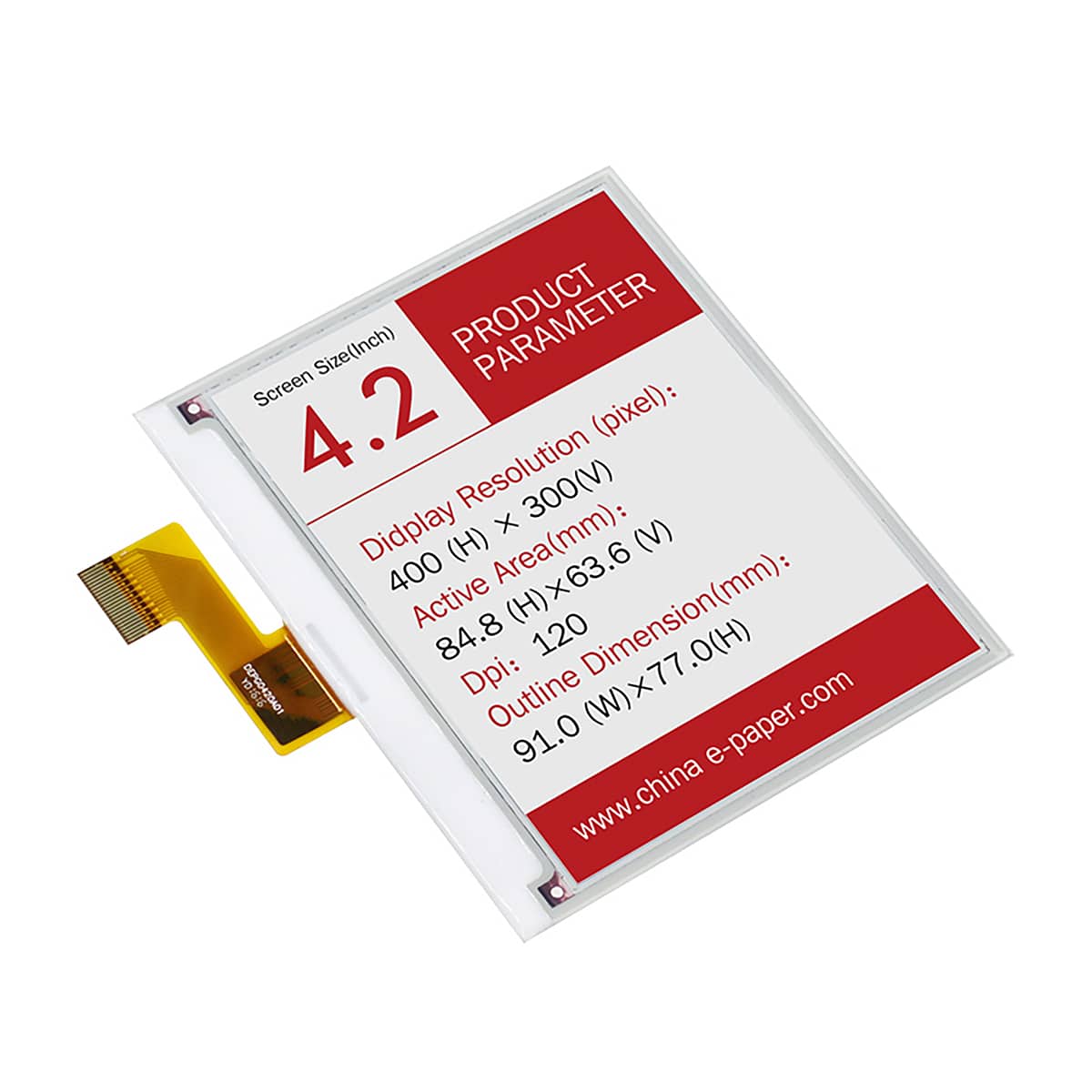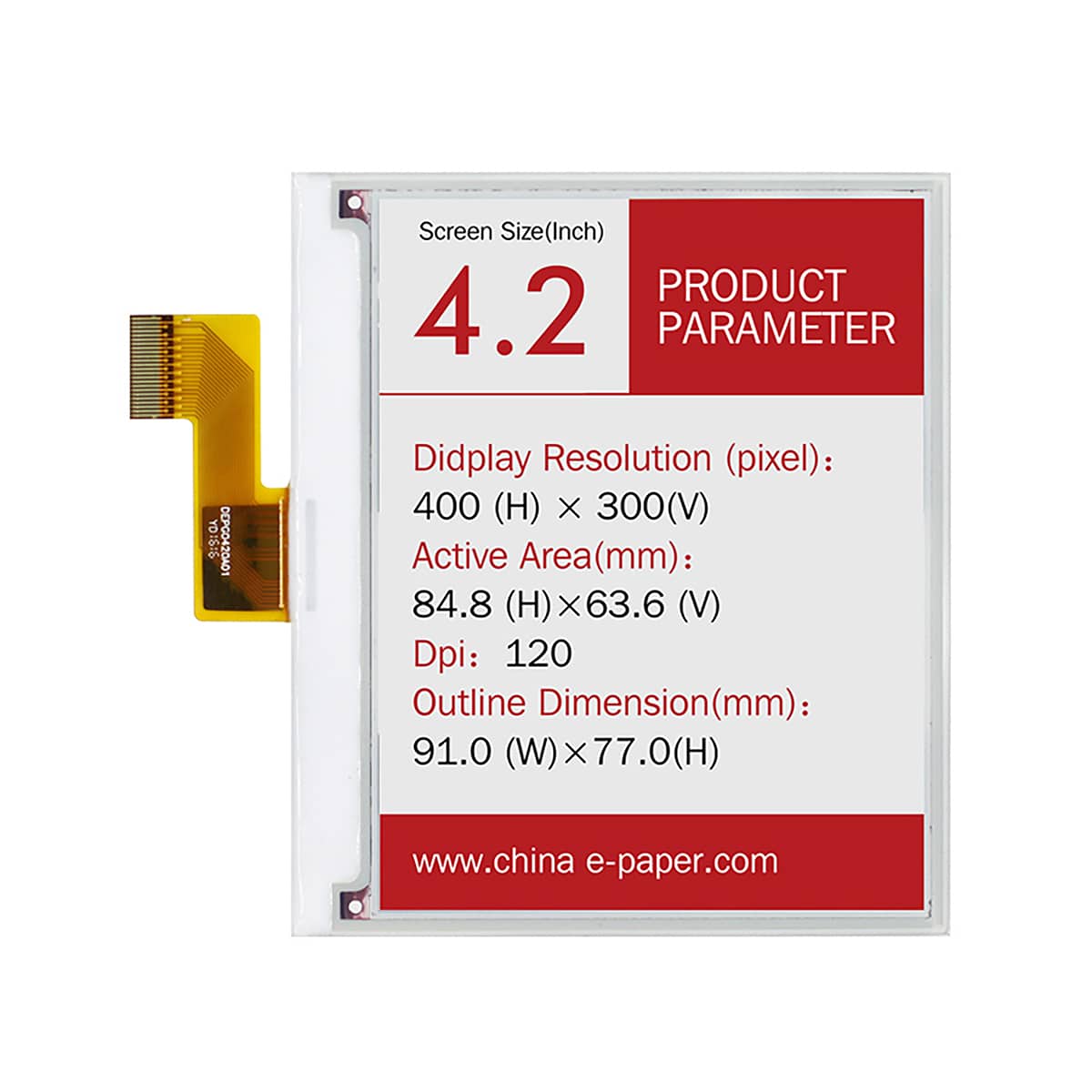 The DEPG0420 series is an Active Matrix Electrophoretic Display (AM EPD). The 4.2 inch active area contains 400×300 pixels. The module is a TFT-array driving electrophoresis display, with integrated circuits including gate driver, source driver, MCU & SPI interface, timing controller, oscillator, DC-DC, SRAM, LUT, VCOM.