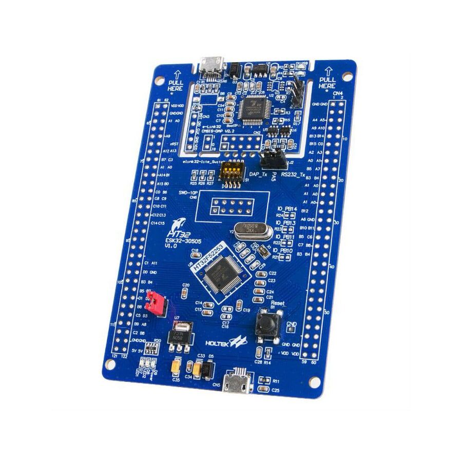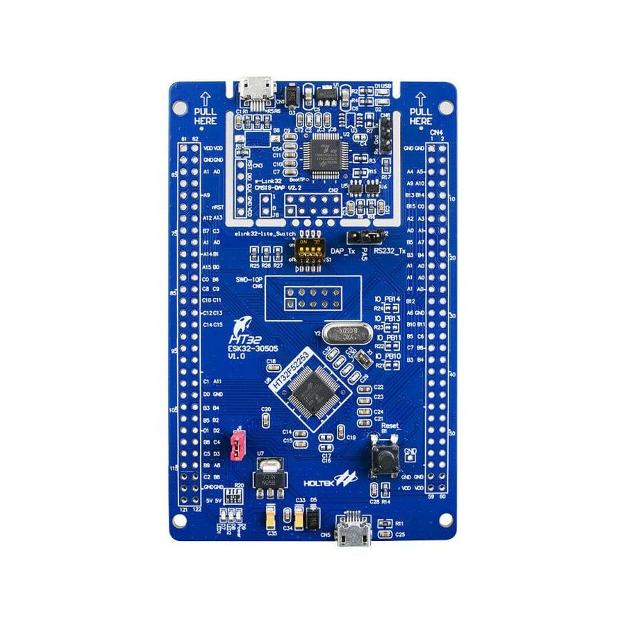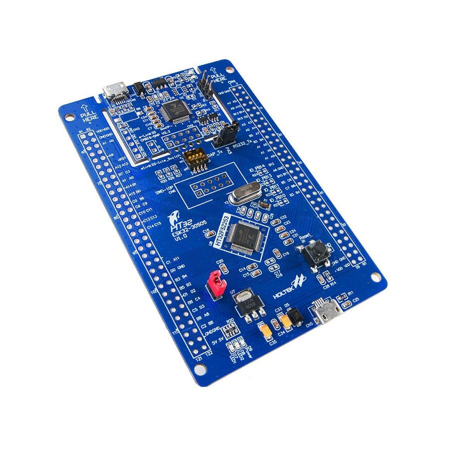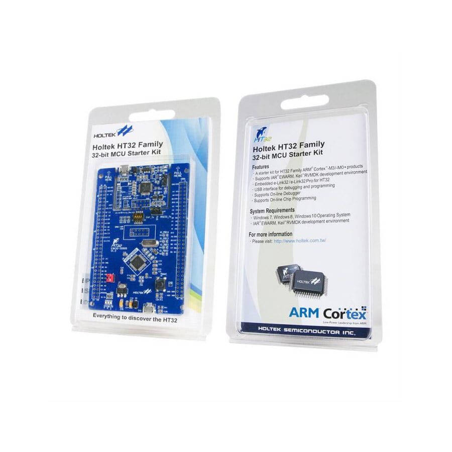 The HT32F52253 Starter Kit uses the 32-bit Arm® Cortex®-M0+ high performance, low-power microcontroller, and is designed to help new users get up and running and using this Holtek device in the shortest possible time frame. It provides a low-cost platform which together with the software development platform, also provides a complete solution from evaluation, programming to production.
