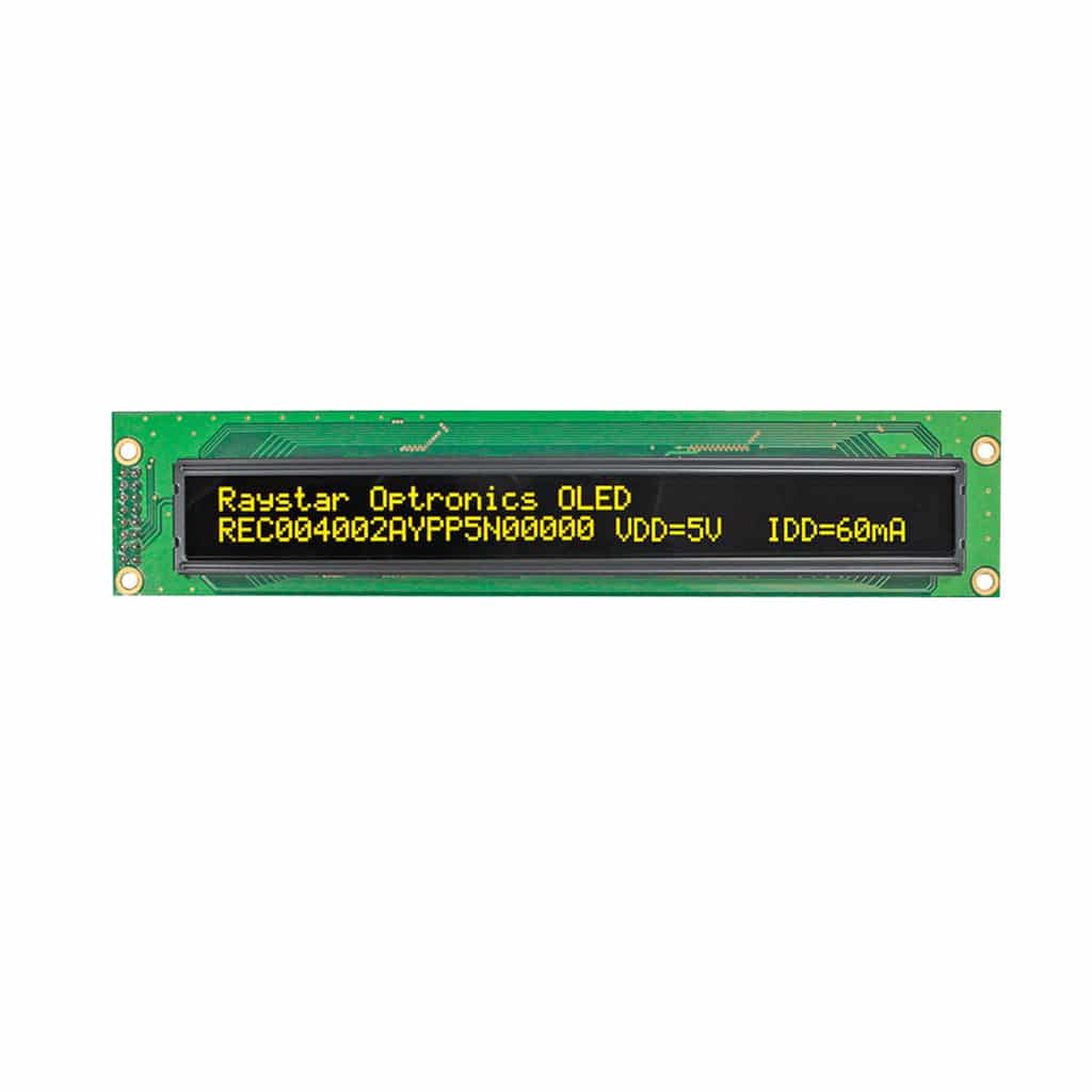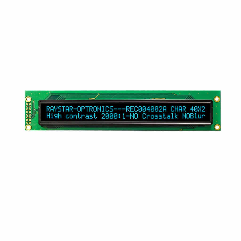 The REC004002A series Chip-On-Board Passive Matrix OLED offers 40×2 characters .With an active area of 148.13mm x 11.85mm within a viewable area of 154.4mm x 16.5mm