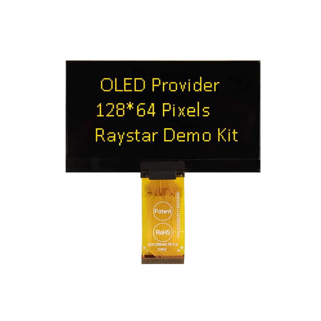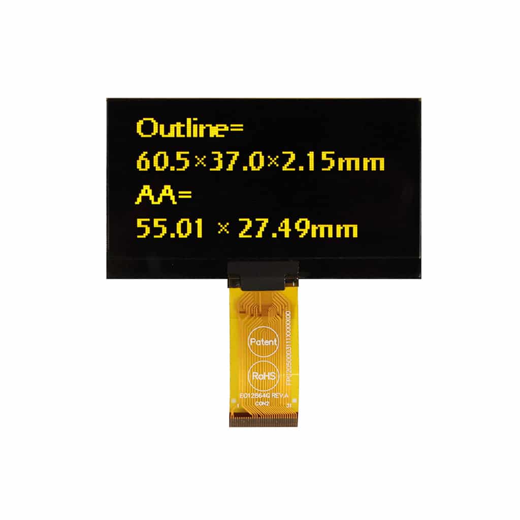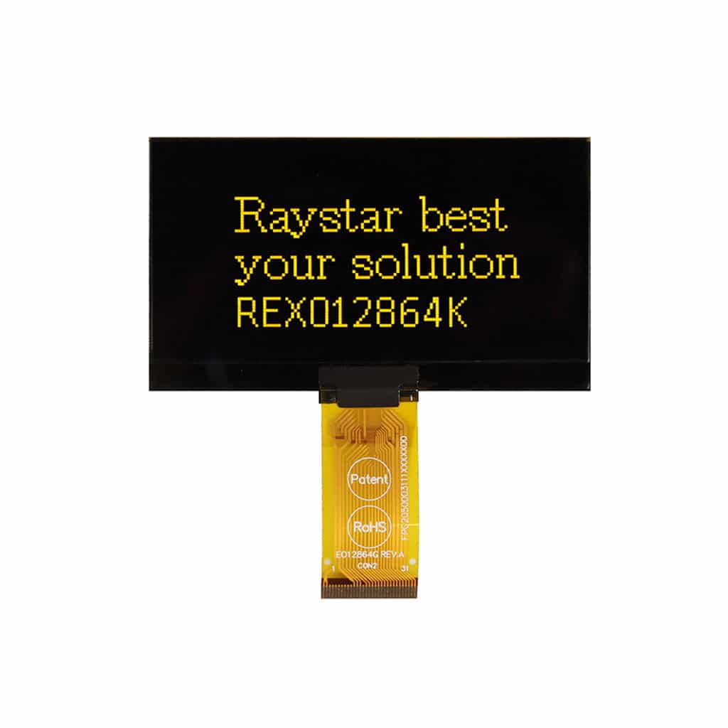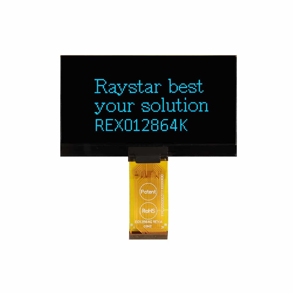 The REX012864K series is a 2.7″ Chip-On-Glass OLED offering 128×64 pixels within a 63.41mm x 32.69mm viewable area, it comes with an integrated SSD1309ZC IC, and is available in Blue, Green, White or Yellow. This device has a choice of 6800, 8080, SPI or I2C interface
