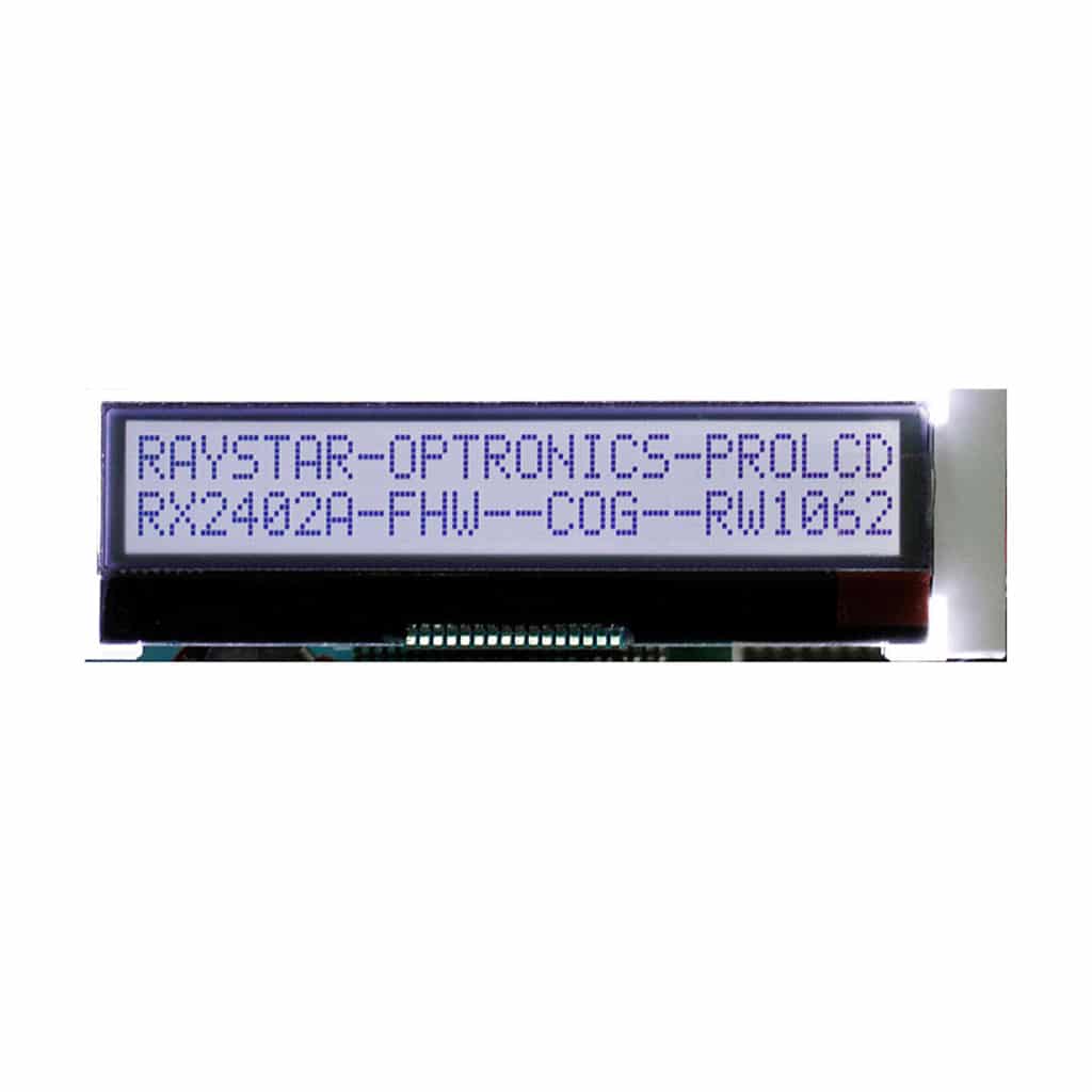 The RX2402A Chip-On-Glass series of character displays is a standard range produced by Raystar Optronics, and is a range designed for the industrial market. Available in either STN or FSTN technologies, customers can also choose if they require a reflective, transflective or transmissive polariser as well as a choice of LED backlight colour (if a backlight is required). Using the RW1062 controller, customers can also select which font type they require, from English/Japanese, English/European or English/Cyrillic