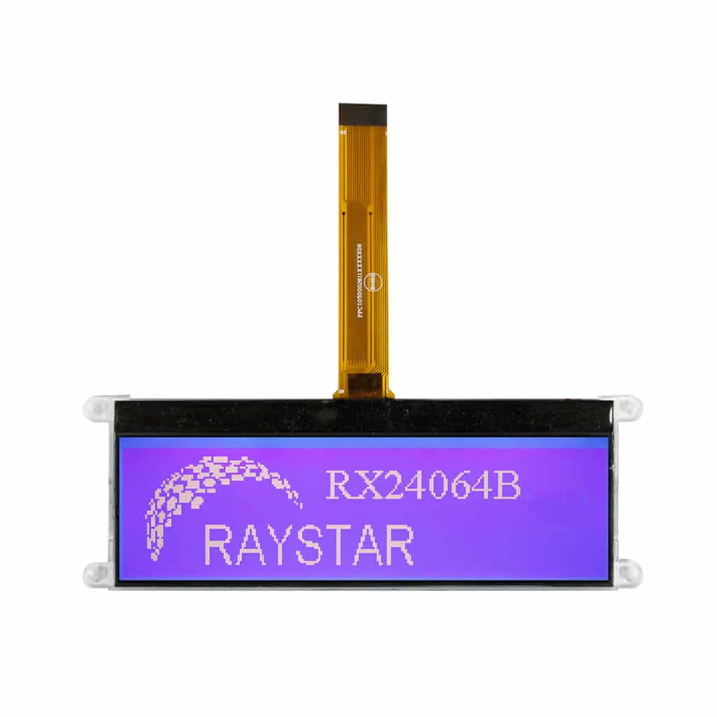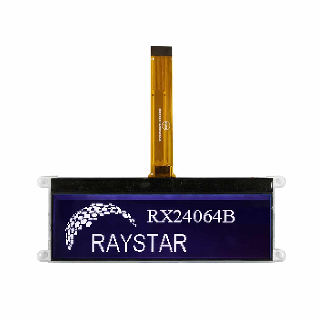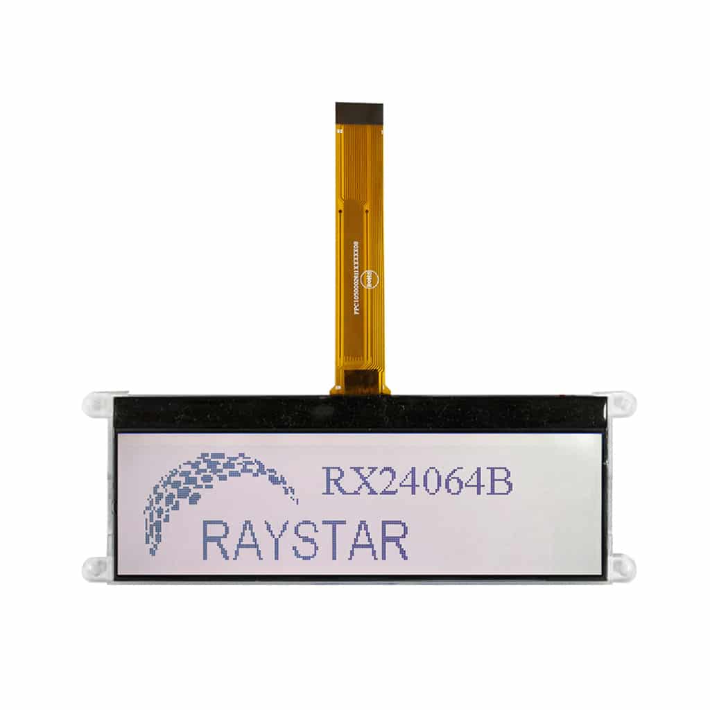 The RX24064B series is a standard Chip-On-Glass LCD offering 240×64 pixels within a 129.0mm x 37.6mm viewable area, with a built in ST7586S-G4 controller (or equivalent)